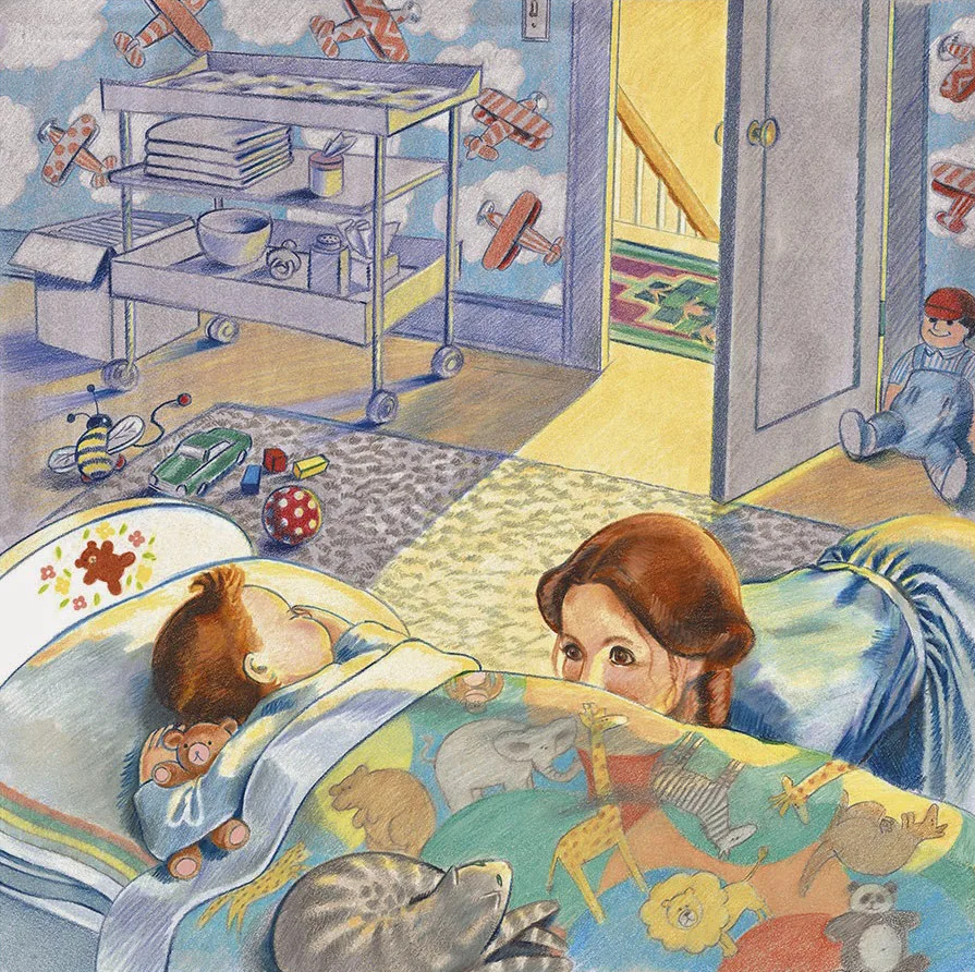 但一到夜里,孩子睡着之后,那母亲总会打开他的房门,沿地爬进房里去,并到牀边擡头偷觑自己的宝贝到底睡着没睡着。只要真睡着了,她便把那九岁的孩童抱将起来,拥在怀里摆呀摆、摆呀摆、摆呀摆,边摇边唱道: