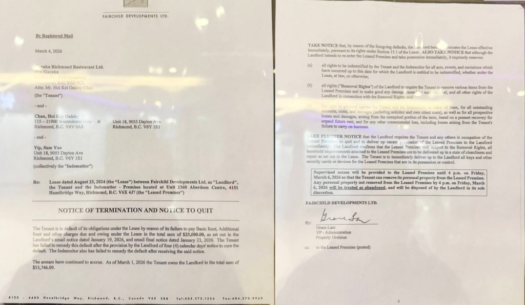 据Noms Magazine报道,多位Noms Mag社区成员见到餐厅门口贴有一则终止租约的通知,证实房东Fairchild已即时终止租约。这间著名的札幌汤咖哩连锁店,是于2023年12月开设的首间加拿大分店。