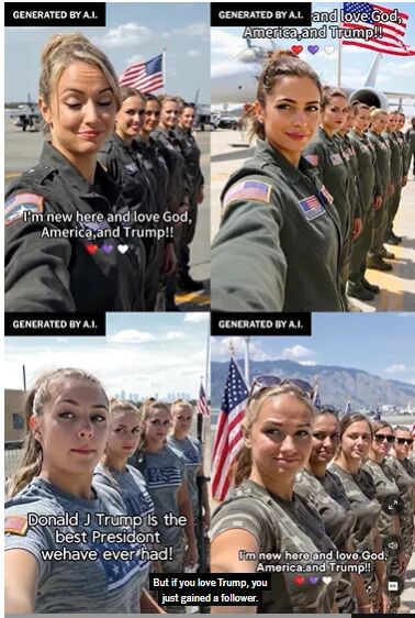 今年春天的一周内,有 10 个不同账号发布了类似内容:一排穿着军装的女性用相同的机械语调说,“ 如果你觉得被冒犯,没关系,继续滑动 ”,然后鼓励观众 “ 点击关注 ”。 其他帖子还出现了变形的美国国旗等人工智能痕迹 。