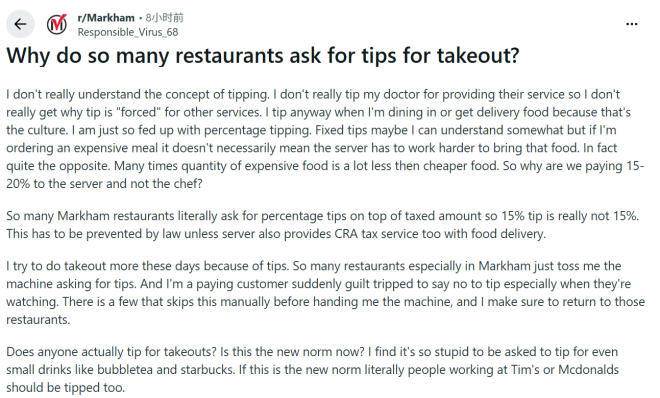近日,万锦社区Reddit论坛上,一则”为什么这么多餐厅外卖也要求小费?”的帖子引发大量关注。发帖人表示,自己不理解为何在外卖、甚至只是买杯饮品时,收银机都会弹出小费选择,而且如果当面点”0″还会觉得尴尬,仿佛被道德绑架。发帖人认为,小费本来是堂食服务才需要给的,现在外卖也被要求付小费,而且金额是按消费额度比例收取,这让人很难接受。更让人无奈的是,精英消费者在点餐时会被人盯着看,很难有底气拒绝。