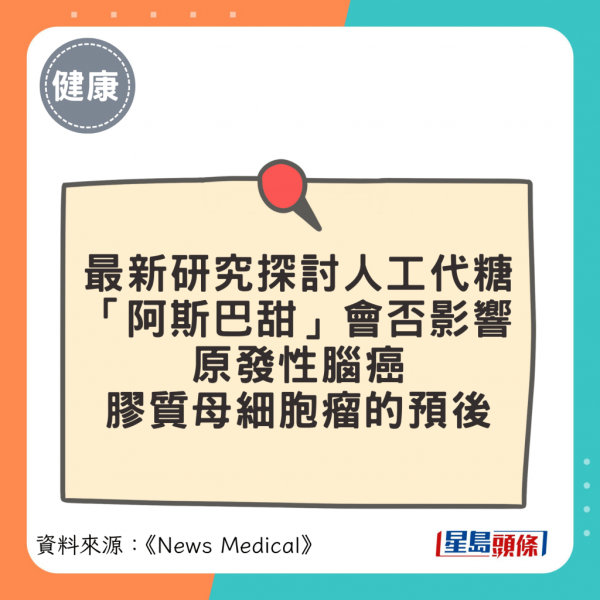 近期发表于《Scientific Report》的最新研究,探讨人工代糖“阿斯巴甜”(aspartame)会否影响原发性脑癌──胶质母细胞瘤(glioblastoma multiforme, GBM)的预后反应。胶质母细胞瘤是一种致命性的原发性脑瘤,增长迅速,对现时的常规癌症治疗反应不佳,并会抑制肿瘤微环境内的免疫反应。