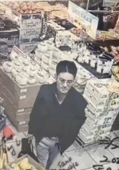 视频显示,一家列治文的H-Mart韩国超市墙上贴满了同一名亚裔男子的多张监控截图,每张照片都标注了具体时间,并写着“meat thief(肉贼)”和“same man(同一男子)”。