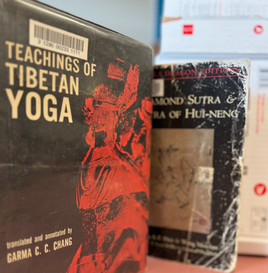 幸运的是,借阅《藏传瑜伽教义》(Teachings of Tibetan Yoga)和《金刚经与慧能坛经》(The Diamond Sutra & the Sutra of Hui-Neng)(上图)的读者无需支付任何逾期费。