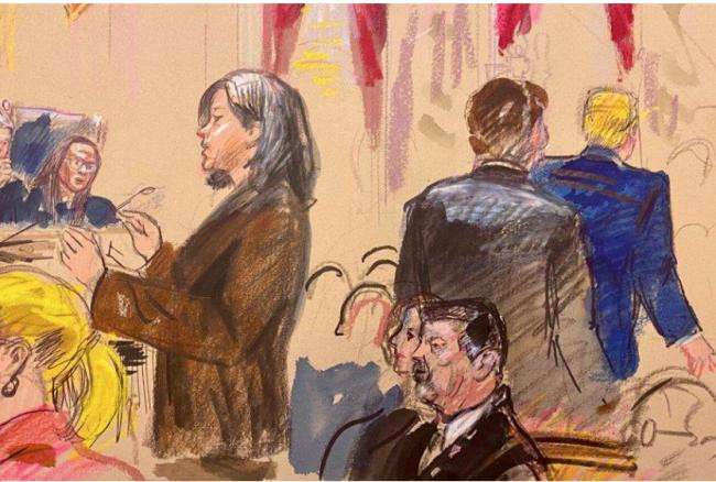 出生公民权案1日在最高法院听审,华裔律师王德棻(左)代表维权团体ACLU出庭,川普总统则到庭旁听一个小时后离去,极为罕见。(美联社)