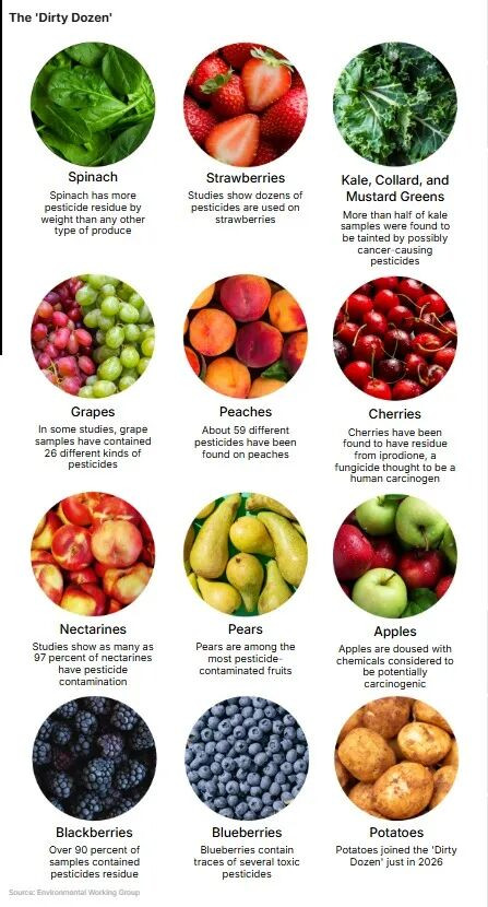 根据EWG分析的近50种水果、蔬菜及豆类,研究团队根据农药残留量评出2025年的“脏十二”(Dirty Dozen),指出部分非有机产品可能成为人类摄入农药的主要来源。