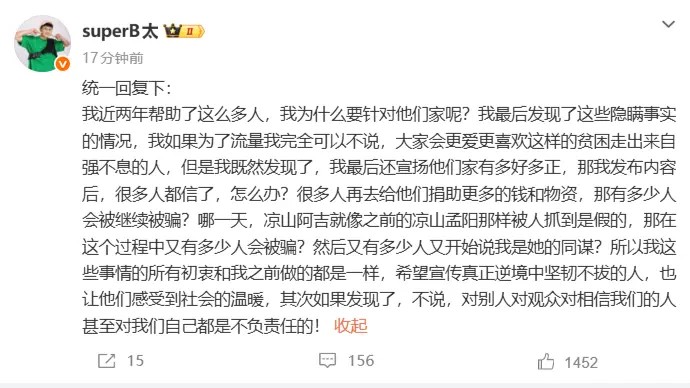 常扶贫参与公益、抖音拥有近2600万粉丝的打假博主“superB太(B太)”,竟然老猫烧须,因心疼4名自称穷到共睡一床的少女,捐出20万人民币帮助她们修建破烂房屋后,才知道她们家境不如想像般穷困,揭发有人说谎。“B太”自嘲做了小丑的短片,上架3天点击已超过3800万次,事件惊动多个部门,包括警方介入。