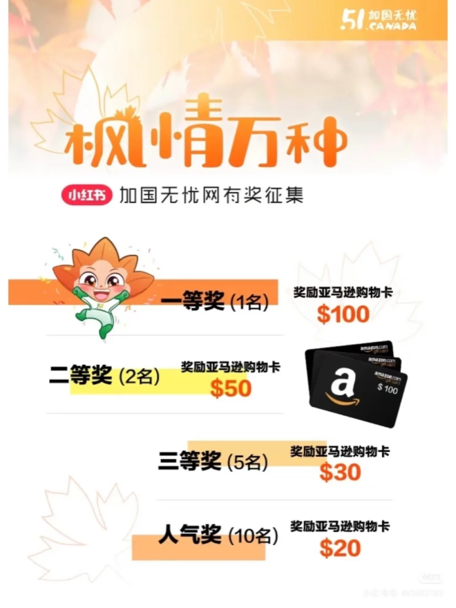 2025“枫情万种”图片征集比赛欢迎网友积极参与! 把你捕捉到的、视角独特的赏枫照片拿出来和网友一起分享,18位幸运儿会得到亚马逊购物礼品卡奖励。