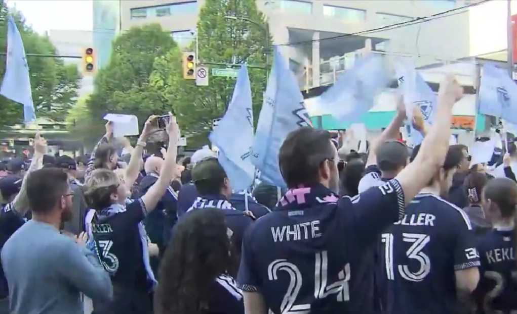周六赛前,数百名球迷举著“拯救白帽队! (Save the Caps!)”的巨幅横额在市中心游行,前往卑诗体育馆。