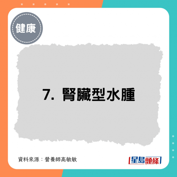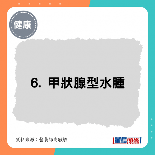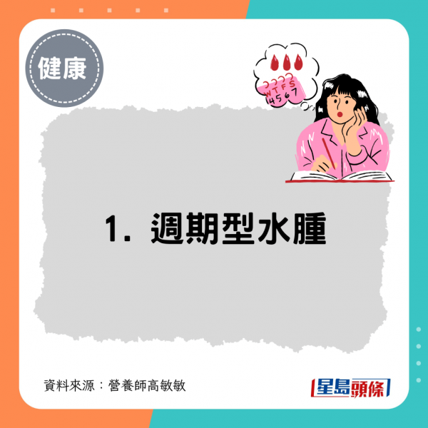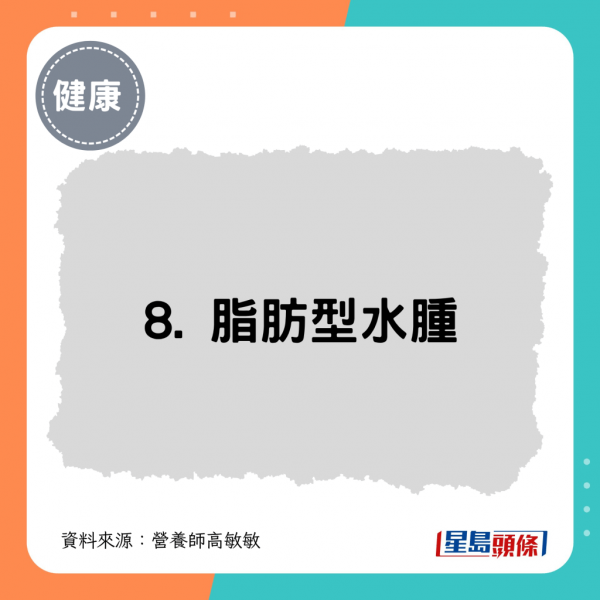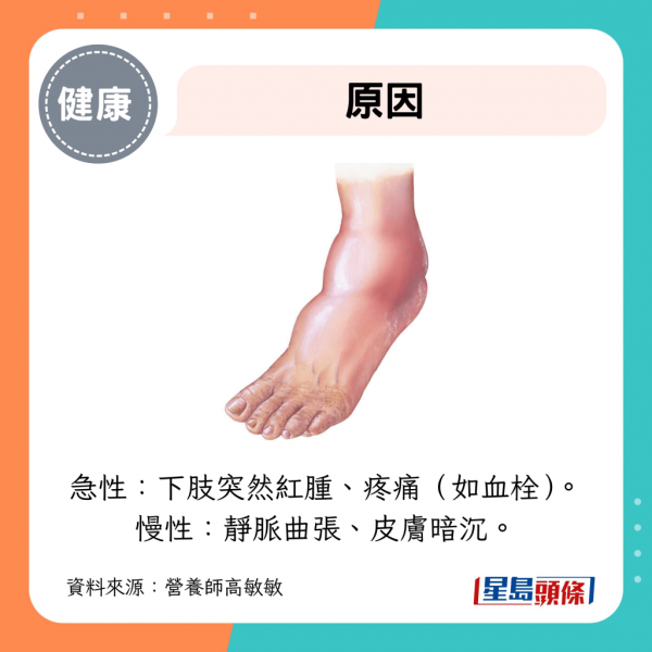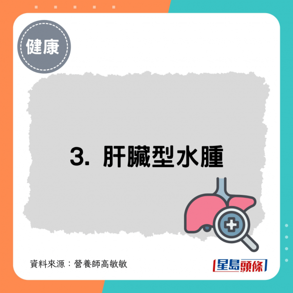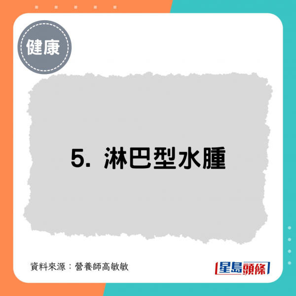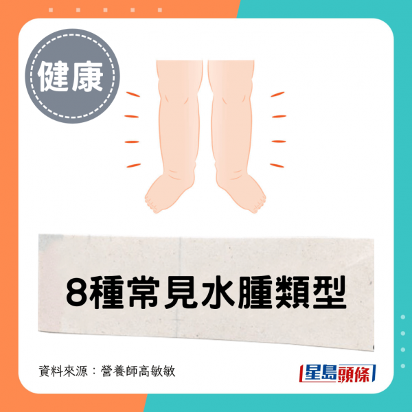 营养师高敏敏在其Facebook专页撰文指,水肿不是由单一原因造成,不同的水肿类型代表着不同的身体警讯。她列出8种常见水肿类型,大家可参考一下: