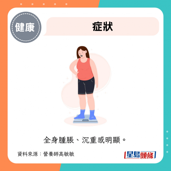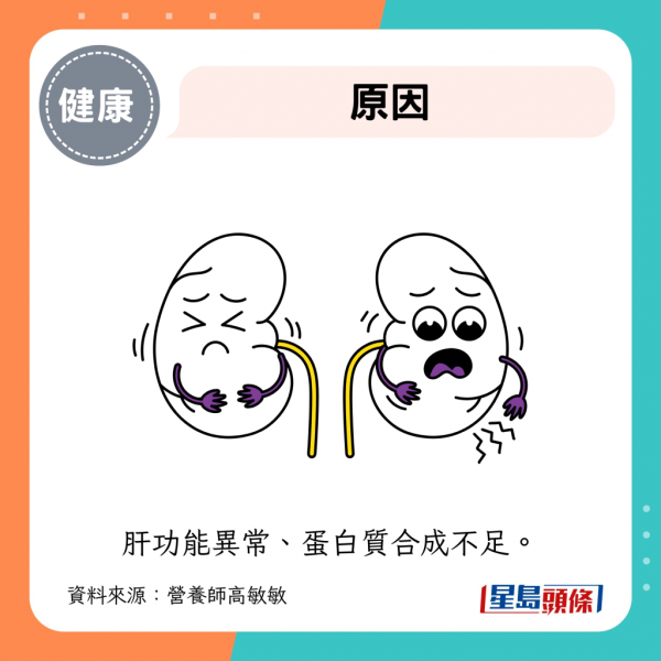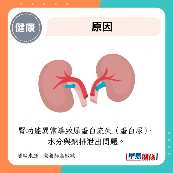 - 原因:肾功能异常导致尿蛋白流失(蛋白尿)、水分与钠排泄出问题。