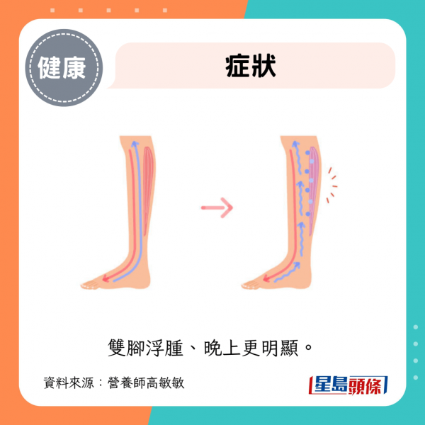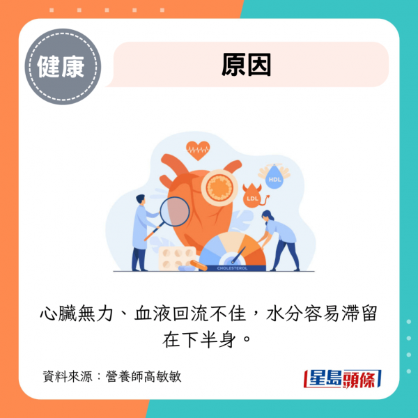 - 原因:心脏无力、血液回流不佳,水分容易滞留在下半身。