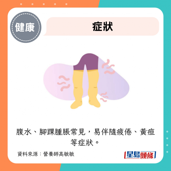 - 症状:腹水、脚踝肿胀常见,易伴随疲倦、黄疸等症状。
