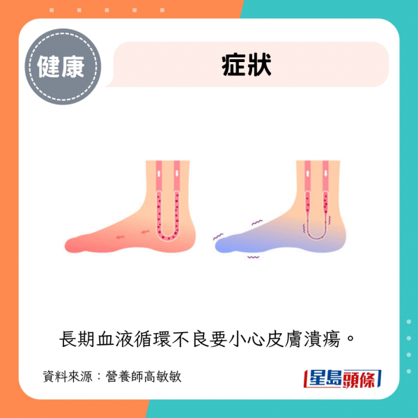 - 症状:长期血液循环不良要小心皮肤溃疡。