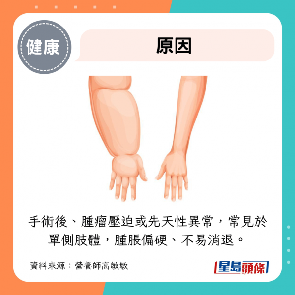 - 原因:手术后、肿瘤压迫或先天性异常,常见于单侧肢体,肿胀偏硬、不易消退。