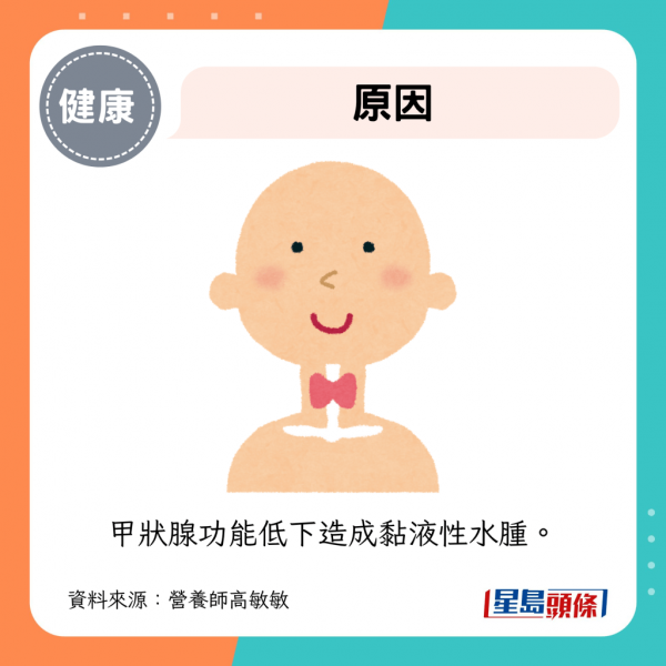 - 原因:甲状腺功能低下造成黏液性水肿。