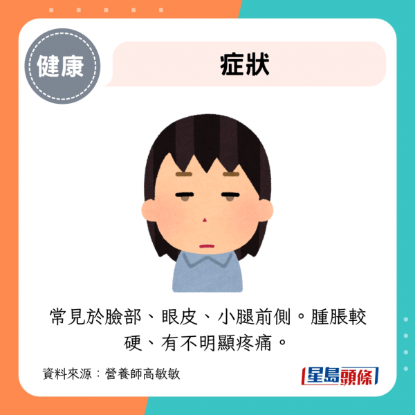 - 症状:常见于脸部、眼皮、小腿前侧。肿胀较硬、有不明显疼痛。