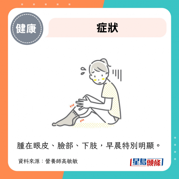 - 症状:肿在眼皮、脸部、下肢,早晨特别明显。