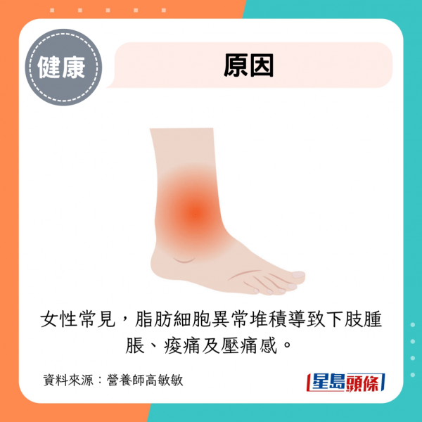 - 原因:女性常见,脂肪细胞异常堆积导致下肢肿胀、酸痛及压痛感。