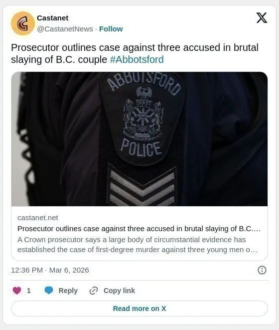 一名皇家检察官表示,大量间接证据已证实三名年轻男子犯有一级谋杀罪,他们被控于2022年在BC省阿伯茨福德市的家中暴力杀害了一对夫妇。