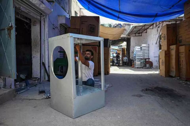 印度德里老城区,工人在市场组装冷风机(新华社图)