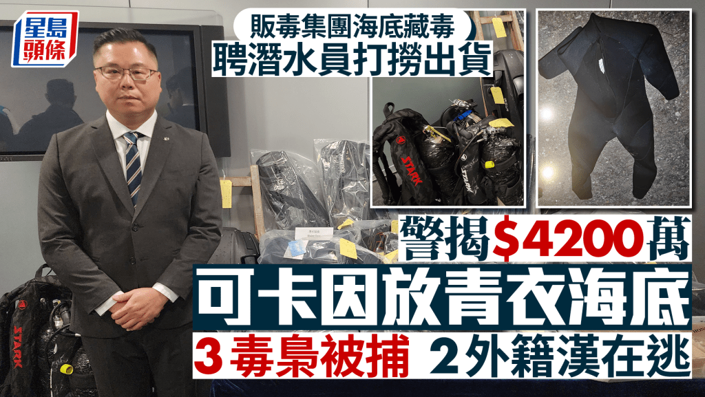 警方首次發現有販毒集團將毒品偷運入境後,收藏在近岸邊水域,再安排潛水員將毒品打撈上岸出貨。警方毒品調查科昨(18日)在青衣青尚路近昂船洲橋底拘捕3名男子,檢獲市值超過4200萬元懷疑可卡因毒品,搗破一個「海底藏毒」販毒集團,並追緝2名在逃外籍人士。