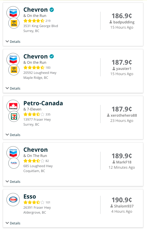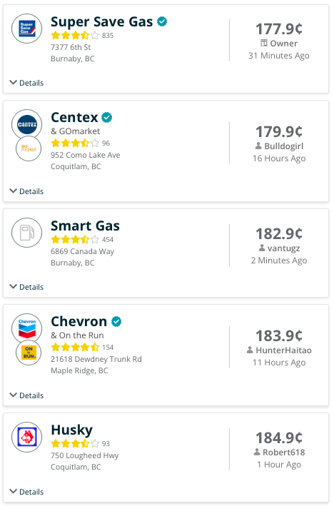 【星岛综合报道】据汽油消息网站gasbuddy于周六(14日)中午12时左右的页面显示,大温地区十间最平油价的油站资料如下图所示,供司机们参考: