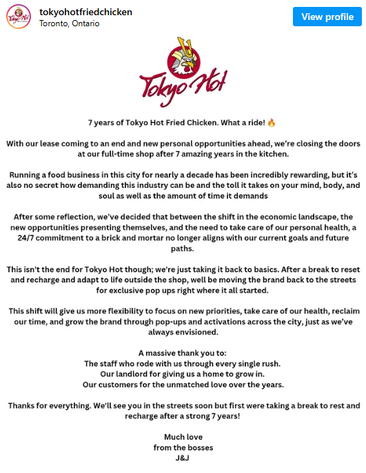 对此,Tokyo Hot Fried Chicken回应称:“我们会带着最初的能量回到街头,很快再见。”