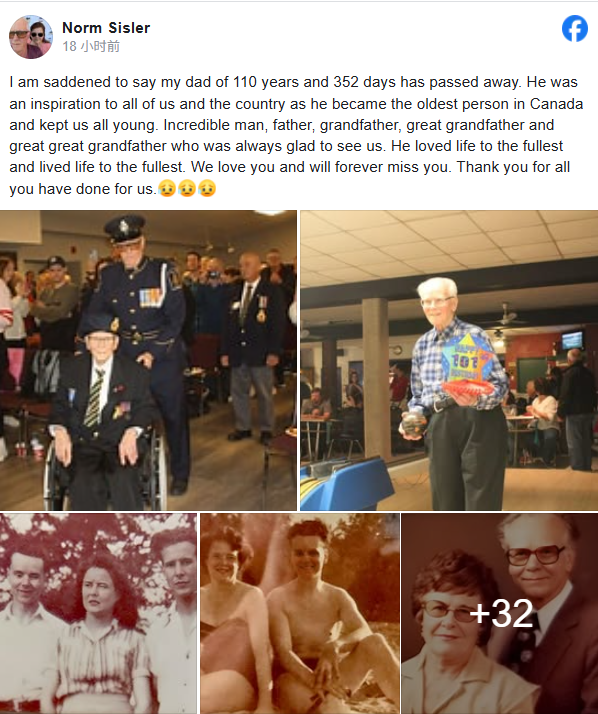 Norm Sisler写道:“他是我们的楷模,也是全加拿大的榜样。他成为加拿大最长寿的人,让我们都觉得年轻。他是一位令人敬佩的父亲、祖父、曾祖父和高祖父,总是乐于见到家人。他热爱生活,也活得精彩。”