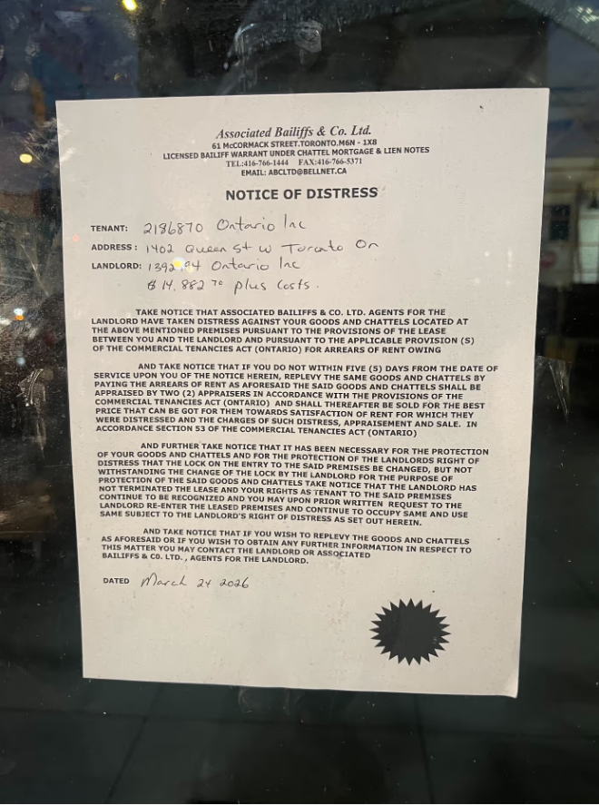 多伦多Parkdale社区的Popeyes门店如今处境堪忧。由于拖欠房租,该店已被房东依法查封。