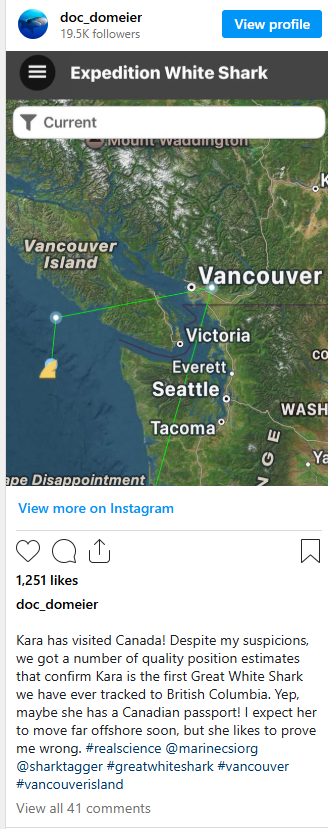 帖子继续表示:“尽管我之前有所怀疑,但我们获得了一系列高质量的定位信息,证实卡拉是我们追踪到的第一条到达BC省的大白鲨”。