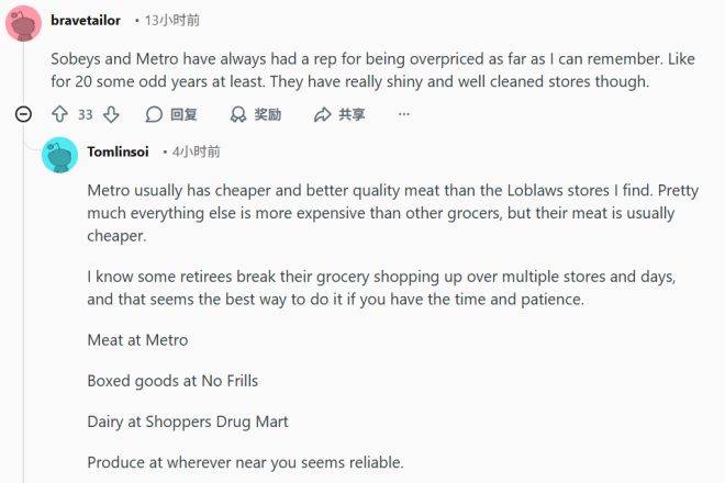 • 一店买全最贵,分开买最省:不少退休老人在同一周分几天跑不同超市,比如肉类去 Metro,干货 No Frills,奶制品在 Shoppers Drug Mart,蔬果哪里新鲜去哪家。
