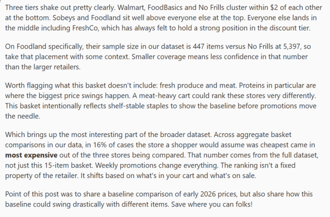 各地差异也不小:这份榜单主要以南安省为主,不同省份和城市有些店名不一样,比如魁省的 Maxi 对应 No Frills 或 Superstore,BC 省的 Save On Foods、Nesters 也属于高价区。西部不少地方只有 Walmart、Superstore、FreshCo 可选。