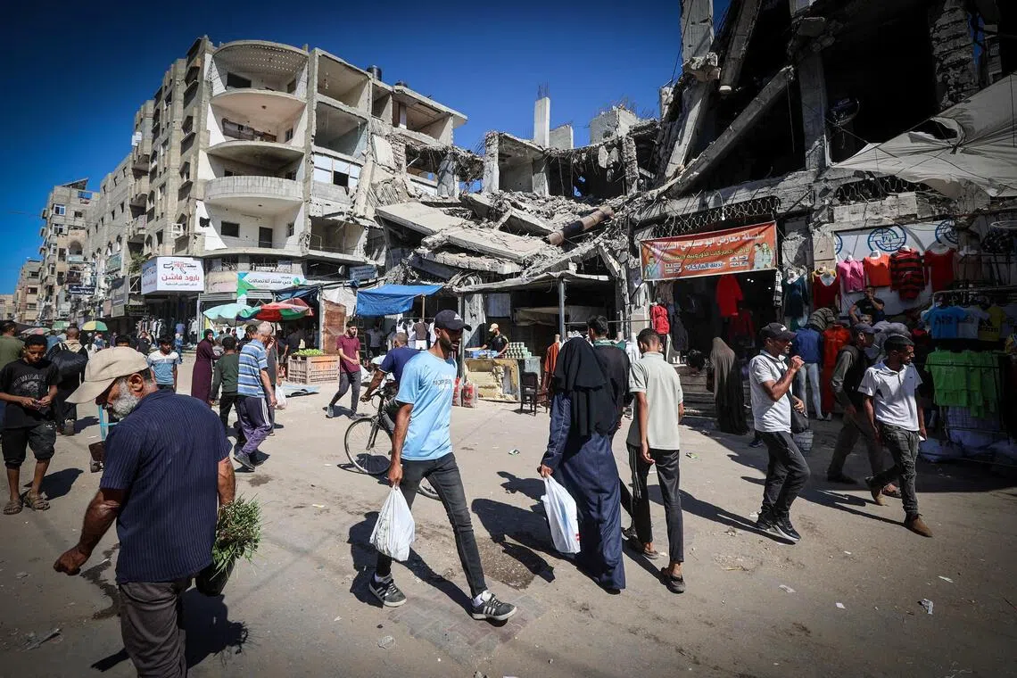 加沙两年来饱受战火蹂躏,大量民房和建筑被毁,但当地巴勒斯坦人的生活仍在继续,中部努塞拉特难民营的临时集市星期三恢复营业。(法新社)