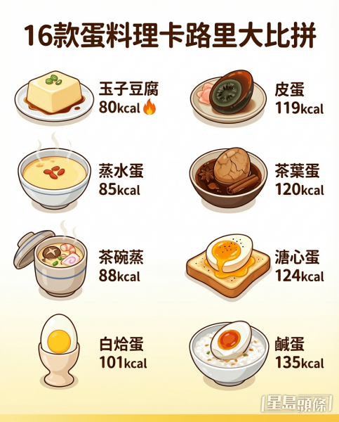 【鸡蛋卡路里】鸡蛋低脂高蛋白,且煮法多样,是不少“操肌”或减肥人士喜爱的蛋白质来源。有注册营养师列出16种常见蛋料理的卡路里,提醒因应不同烹调方法,卡路里可以有很大的差异,例如玉子烧和炒蛋的热量是白烚蛋之2至3倍。