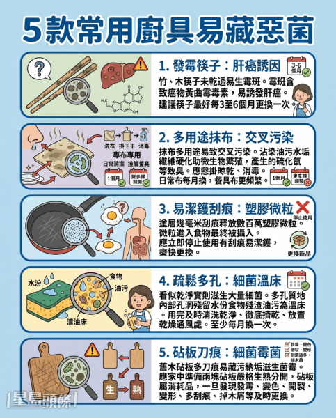 除了电饭煲的保温问题,多位专家亦同时指出,以下这些5种常用的厨具同样需要警惕: