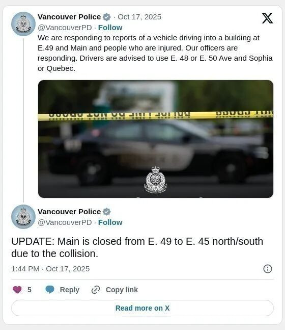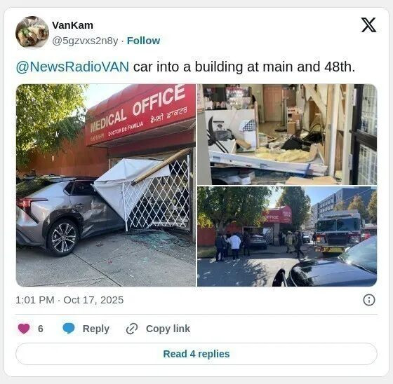 社交媒体上流传的照片显示,一辆汽车撞上温哥华Main St和第 48 街的一间医疗诊所。