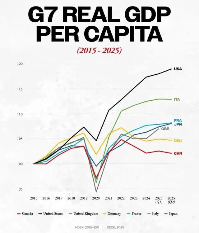 自由党自2015年执政以来的经济数据提供了一个令人不安的对照。加拿大的总体GDP仍在增长,但人均实质GDP与生产率的表现却显著疲弱。人口增长推高了总量,却未能同步提升个体的购买力与收入增长。住房供应长期失衡,租金与房贷压力叠加在中产阶层身上。联邦债务占GDP比例虽未达历史极端,但已远高于疫情前水平。