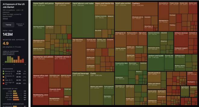 他从美国劳工统计局提取了 342 个职业,用 LLM 对每个岗位逐一评分,并制作了一张树状图,直观呈现出各职业的规模与 AI 风险等级。