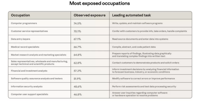 巧的是,Anthropic 自己的劳动力报告里也有一张表格单独列出这些职业,其中计算机程序员暴露度达 74.5%,客服代表 70.1%,数据录入员 67.1%,病历专员 66.7%。