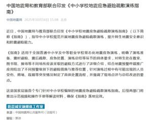 两部门联合印发《中小学校地震应急避险疏散演练指南》