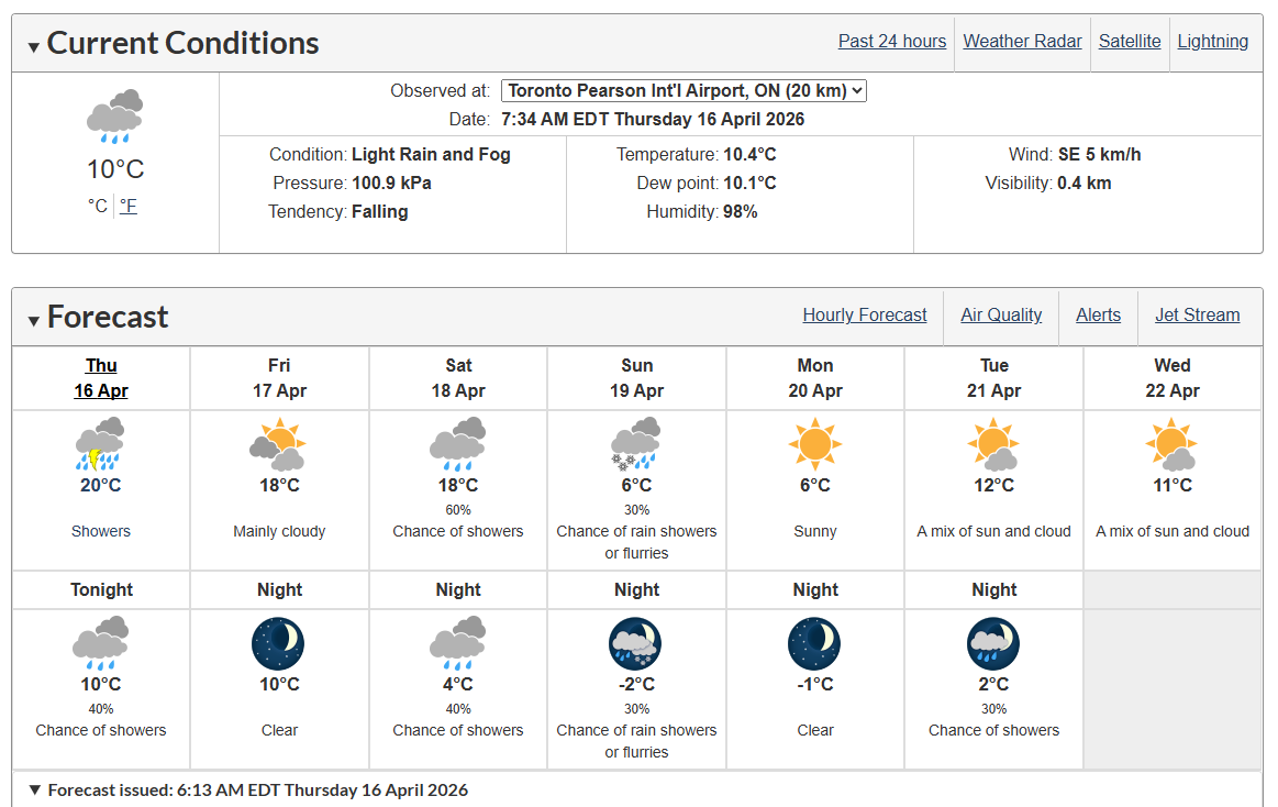 【星岛综合报道】多伦多今(16日)处于特别天气声明之下,预计降雨量最高可达20毫米。此外亦有黄色浓雾警告。