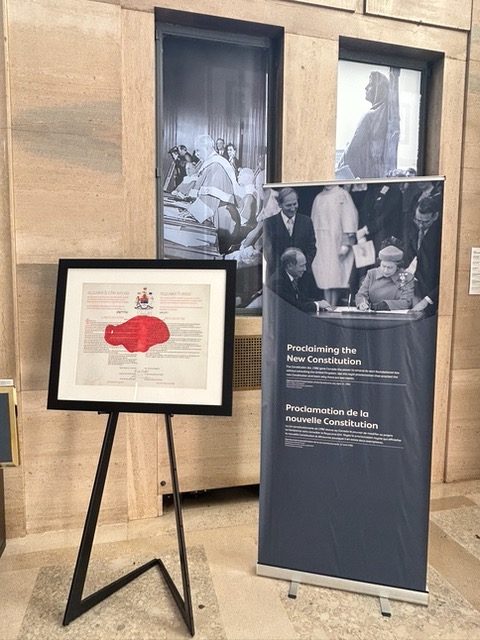 笔者驻足在加拿大女王伊莉莎白二世于1982年4月17日所颁布《1982年宪法法案》的皇家公告面前许久。这份公告一式两份:第一份公告在仪式时被雨滴淋湿损坏(在签名处有非常细微的雨淋痕迹);第二份的公告在1983年遭到一名抗议加拿大北部飞弹试射的人士泼洒颜料,也导致受损。这两份或许外表不完美的公告可能更真实地象征著加拿大这个国家在过去一个半世纪所遭遇的挑战与成长。