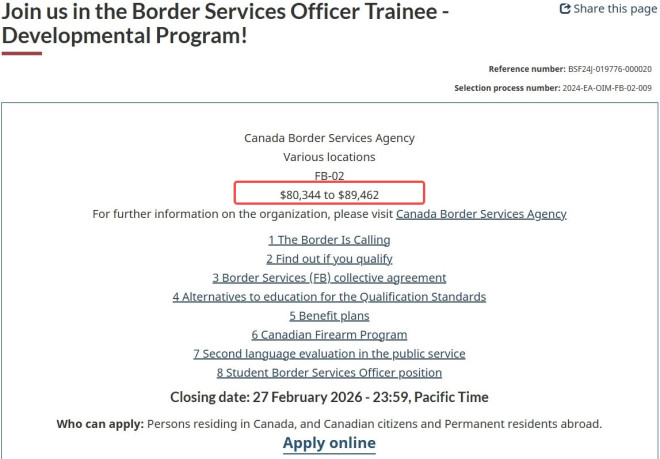加拿大政府官网显示,边境官在培训期的年薪高达9万元: