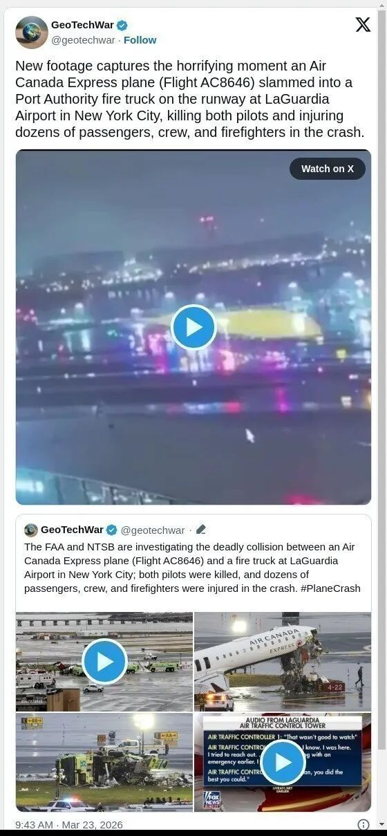 美国国家运输安全委员会发布了关于上个月在纽约拉瓜迪亚机场发生的加拿大航空喷气式飞机与消防车相撞的致命事故的初步报告。结论是通信故障和消防车缺少应答器是造成此次碰撞的原因。