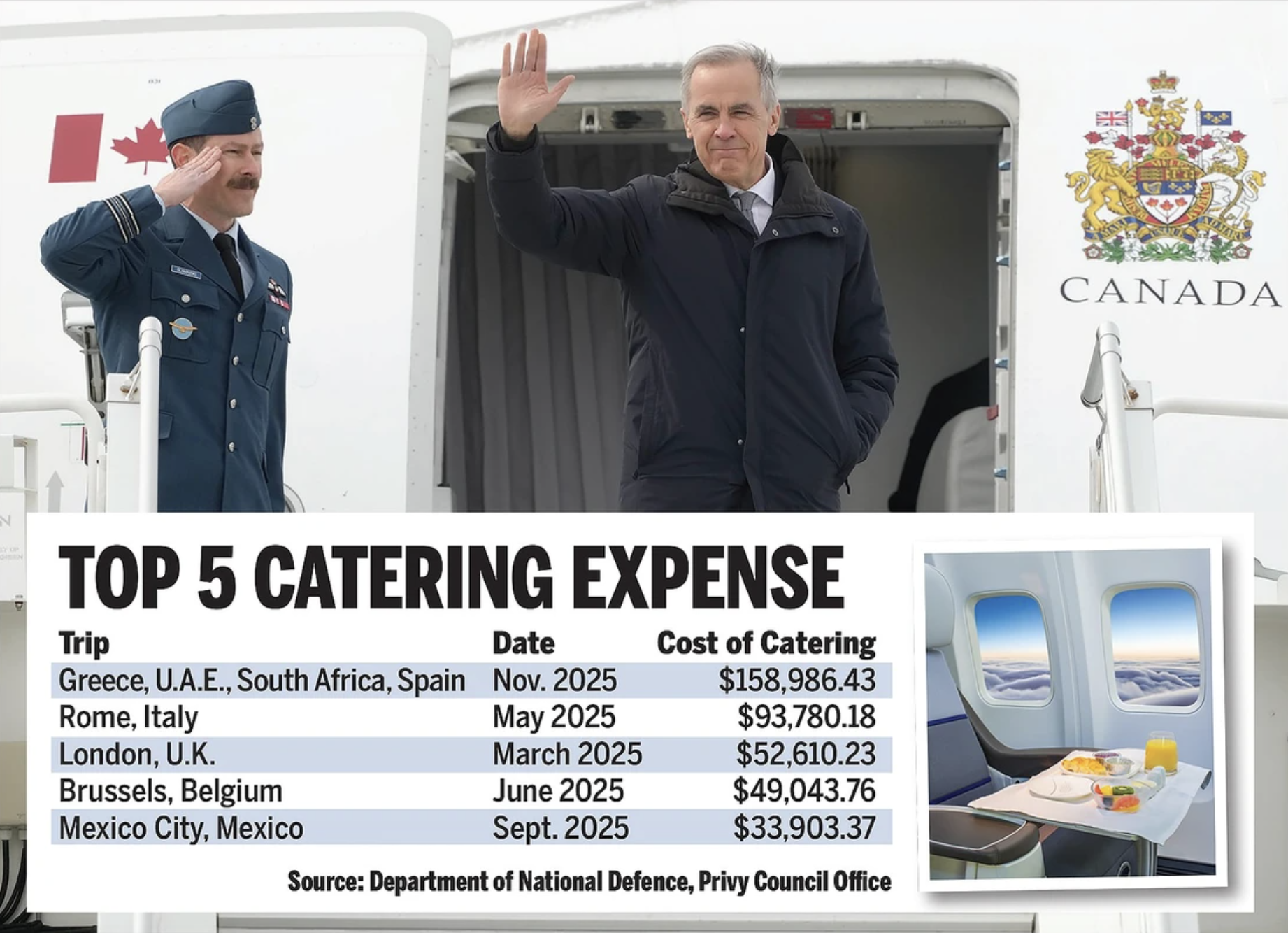 【星岛综合报道】总理卡尼(Mark Carney)上任首年专机餐饮开支高达逾52万元,引发外界对政府开支的关注。有数据显示,部分短途外访航班的餐饮费甚至远高于燃油成本。