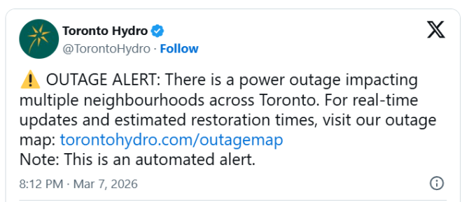 如需更多停电信息,居民可联系 Hydro One 查询。