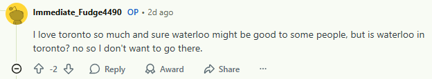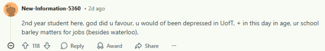 “我是个大二学生,说真的,这其实是老天在帮你——要是去了多伦多大学你可能会很压抑。而且现在这个时代,找工作时你读哪所学校其实没那么重要(滑铁卢大学除外)。”
