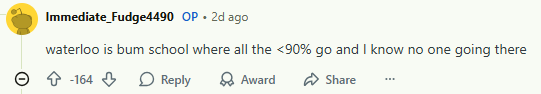 可能是被父母洗脑过度,po主甚至语无伦次地说:“滑铁卢大学是所烂学校,平均分90%以下的学生才去那里,我认识的人里没有一个要去那里。”