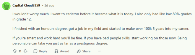 “你不用太担心。我上卡尔顿大学(Carleton University)的时候,它还没有现在这么出名。我高三的时候成绩也就80多分。我最终拿到了荣誉学位,找到了本专业的工作,工作五年后年薪就超过了10万加元。如果你聪明又努力,一切都会好。如果你人际交往能力差,现在就得开始锻炼。会做人在职场上能带你走得和名校文凭一样远。”