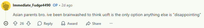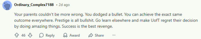 面对网友们的安慰与鼓励,po主回复说:“兄弟们,亚洲父母给我洗脑了,让我觉得多伦多大学是唯一选择,其他任何选择都‘令人失望’。”